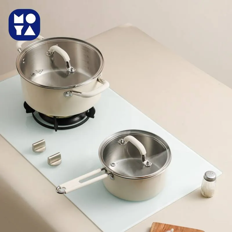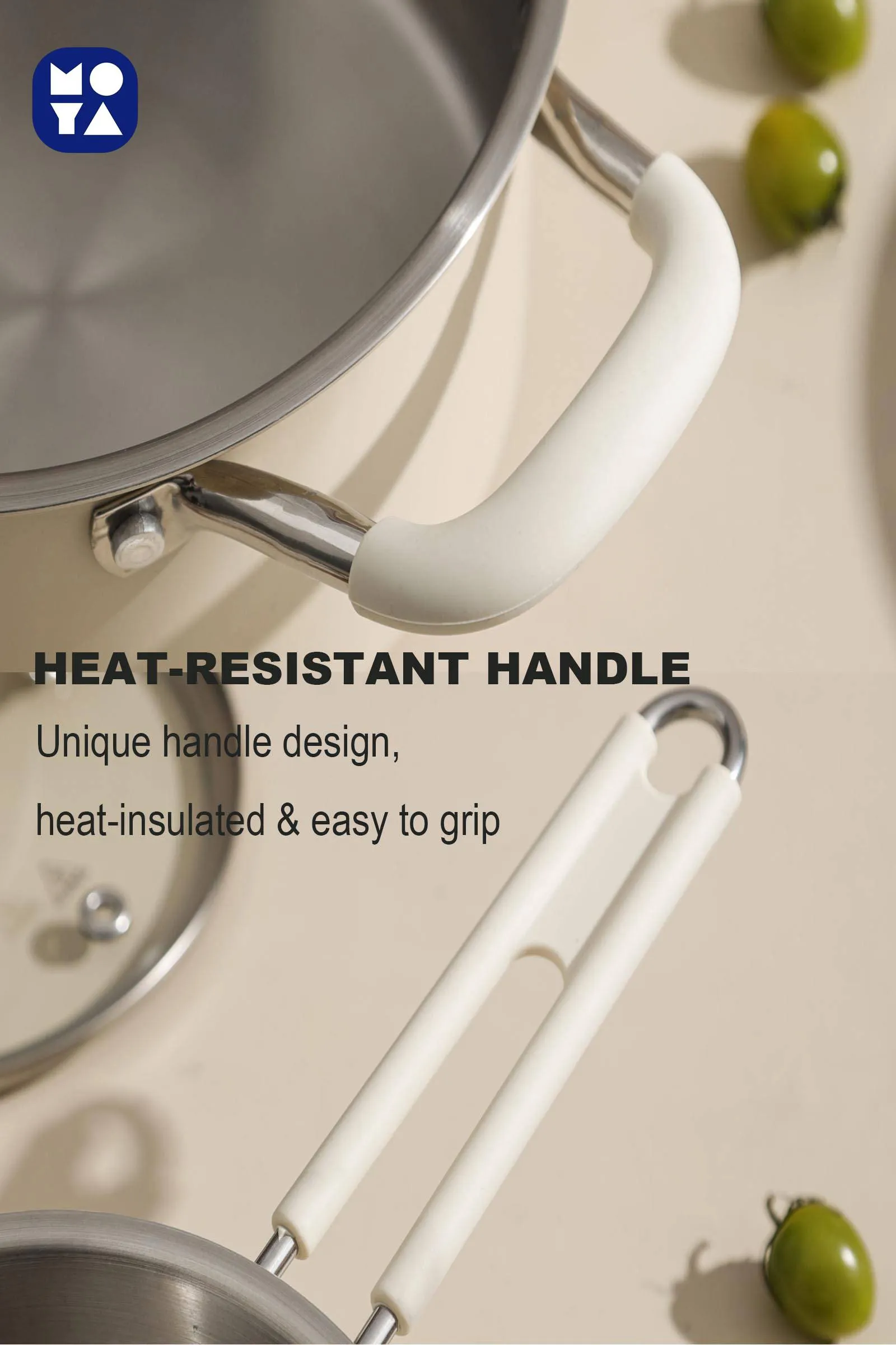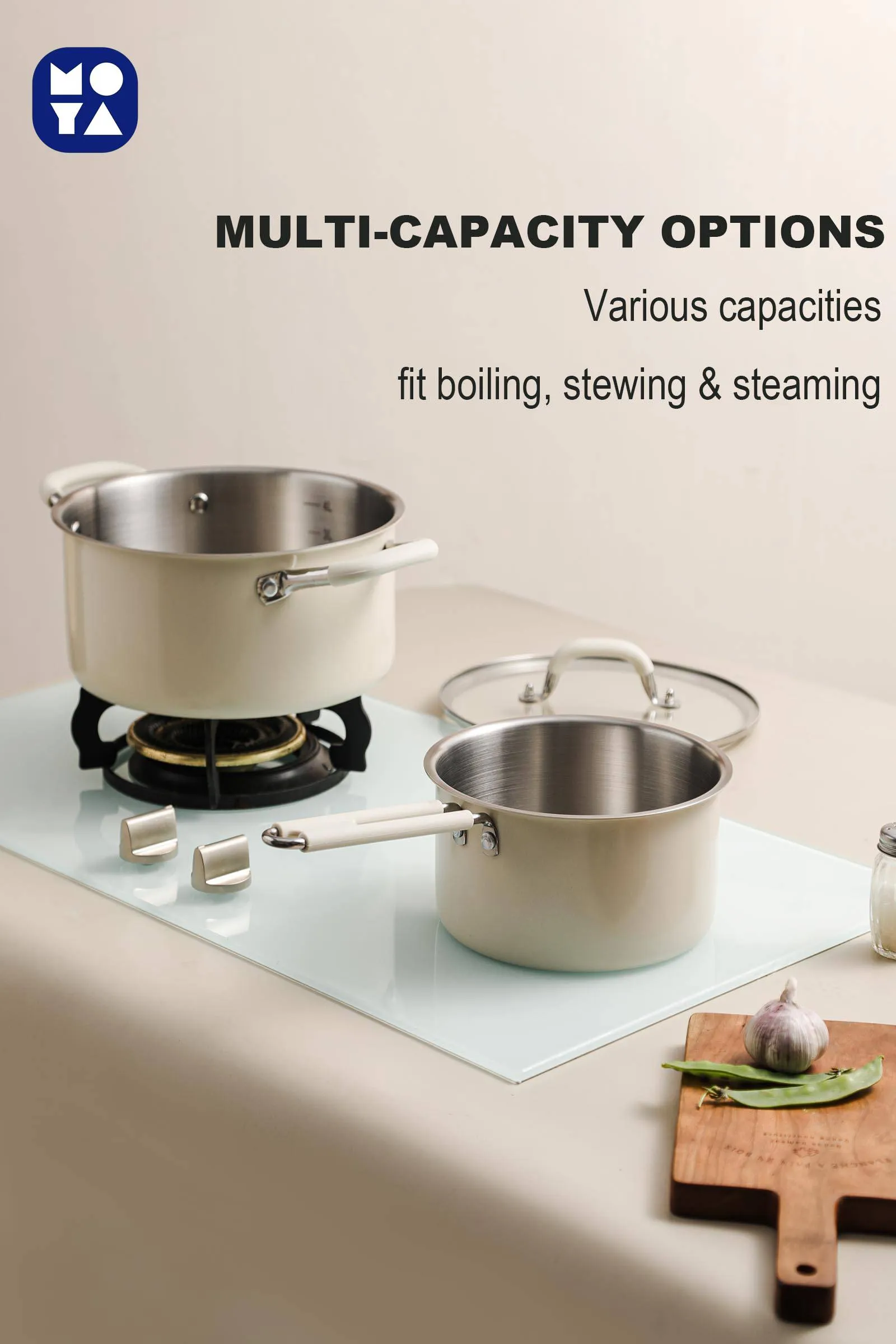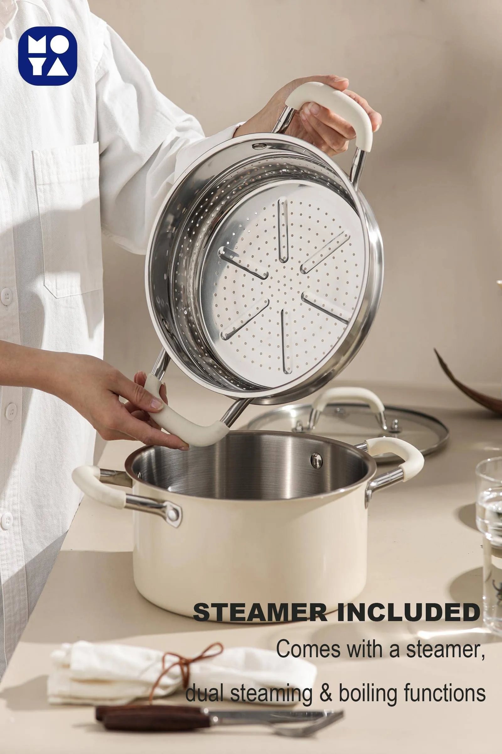 MOYA クリームホワイト304三層鍋&蒸し器セット - ホームキッチン用耐熱ハンドル調理器具