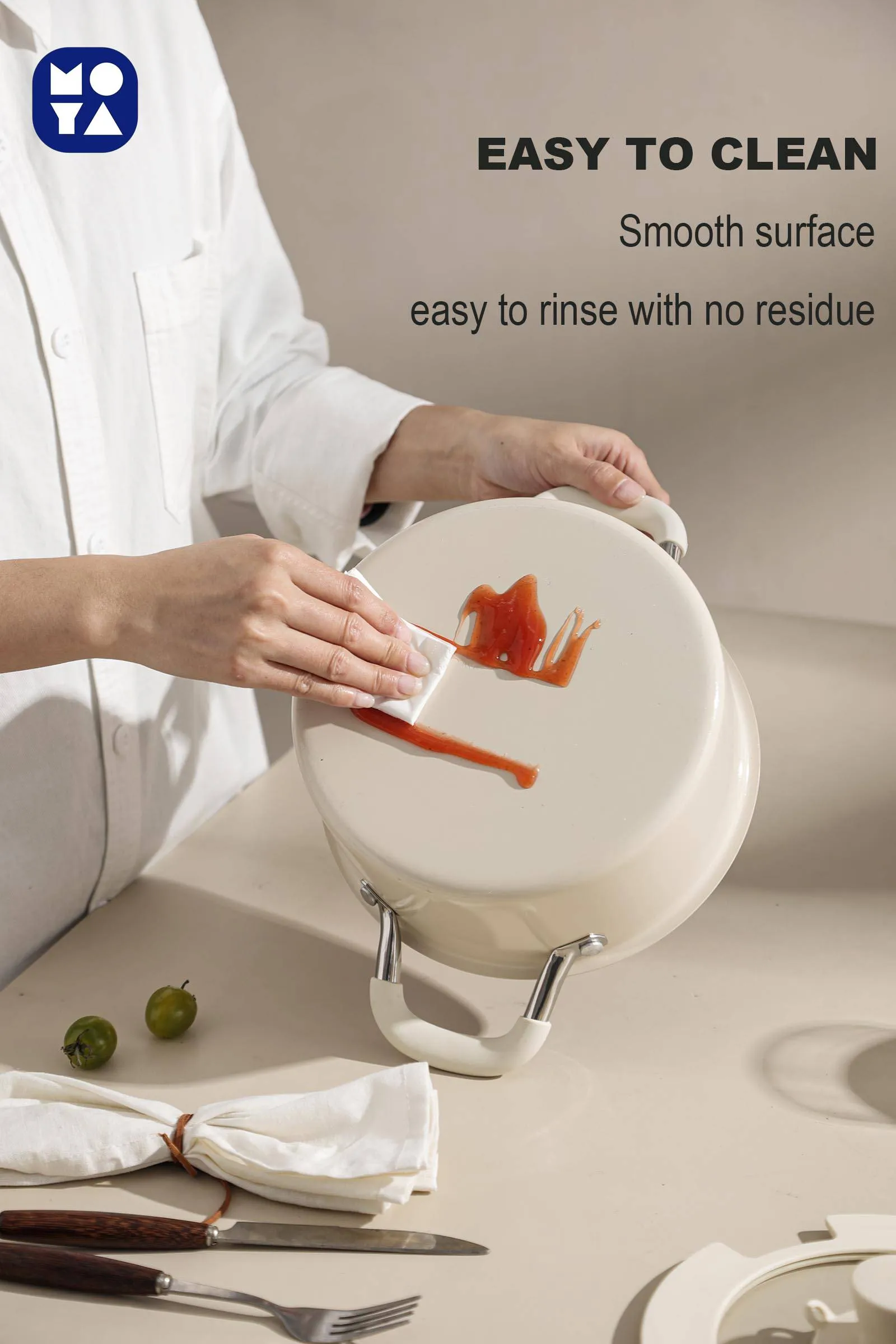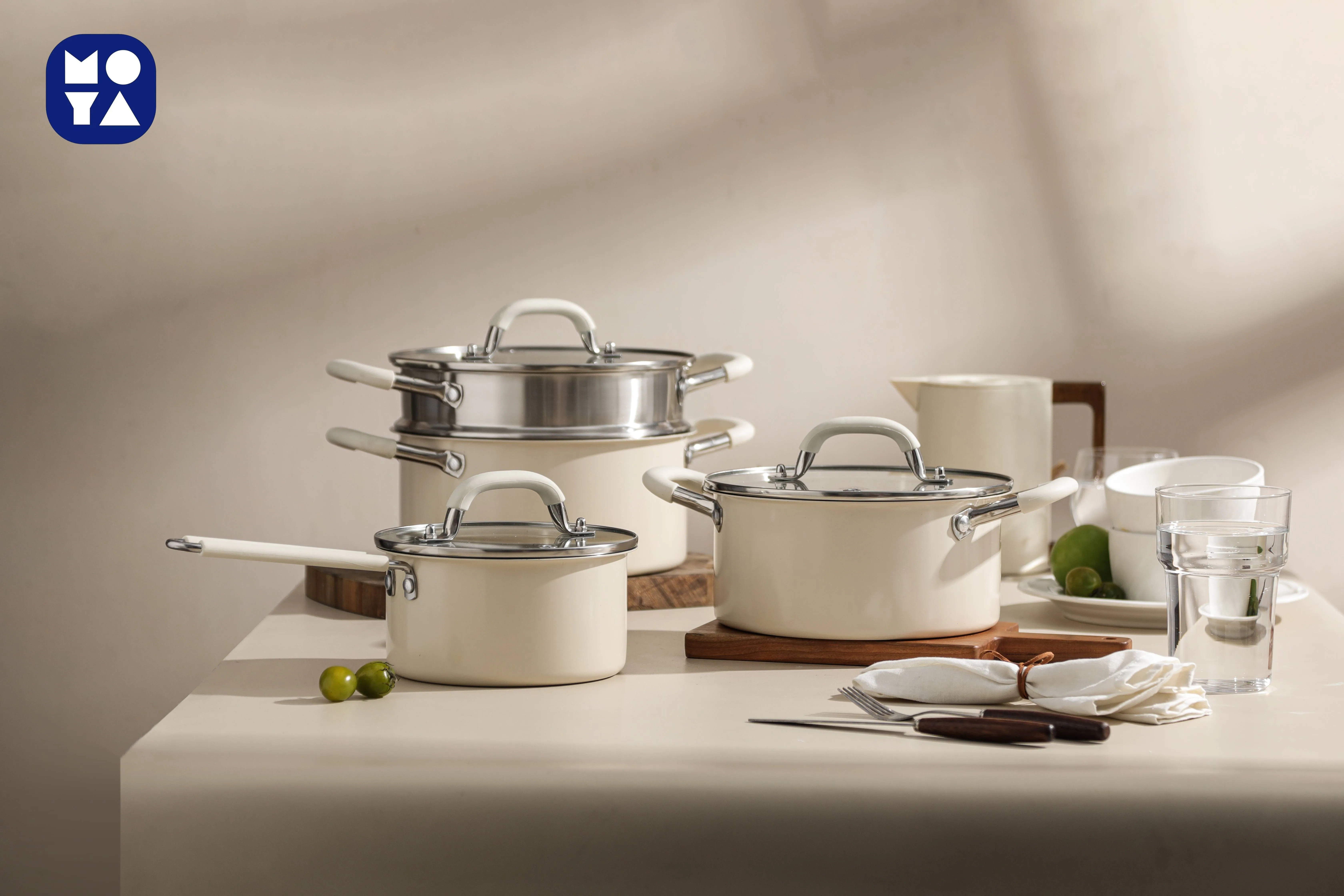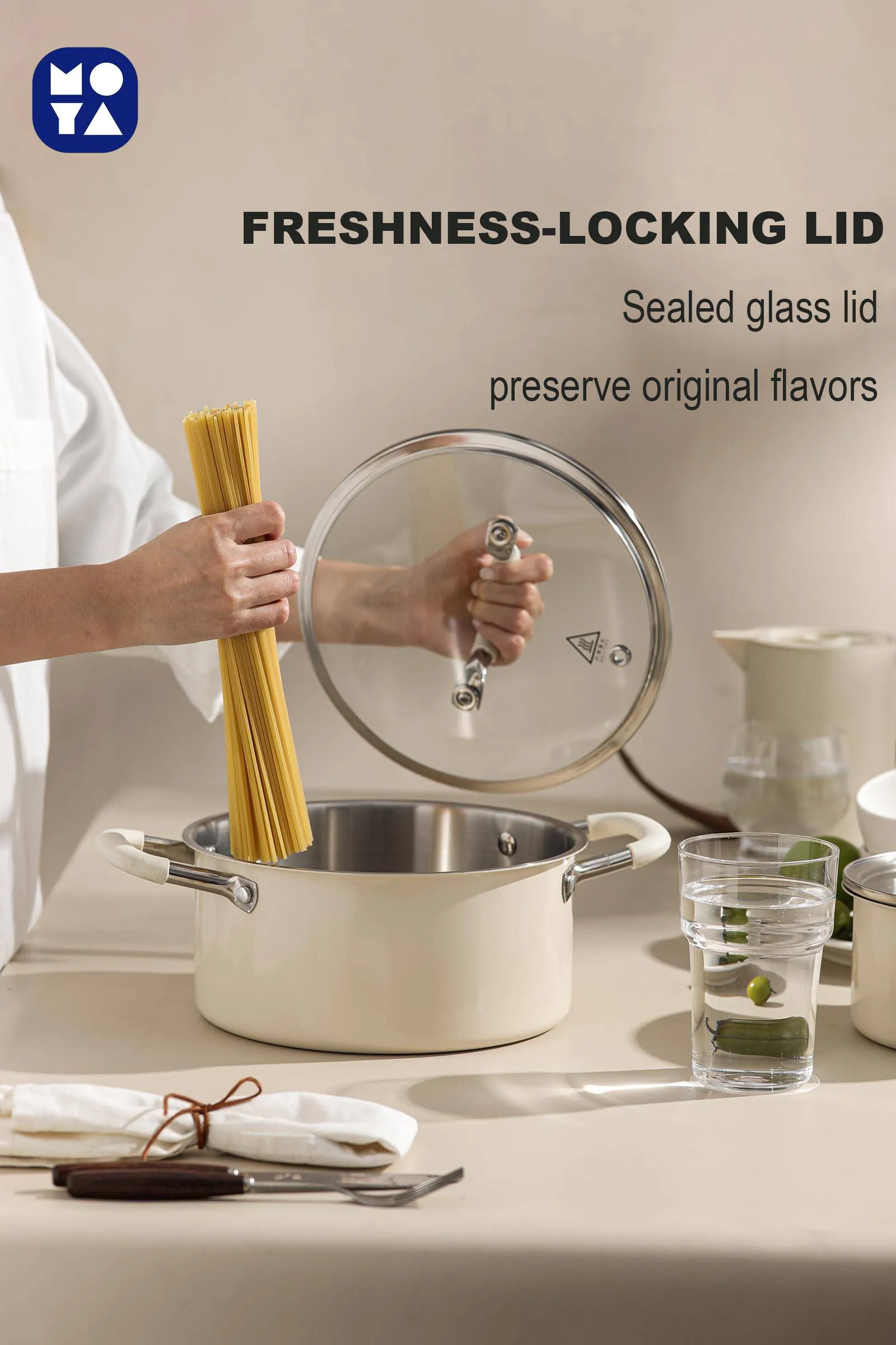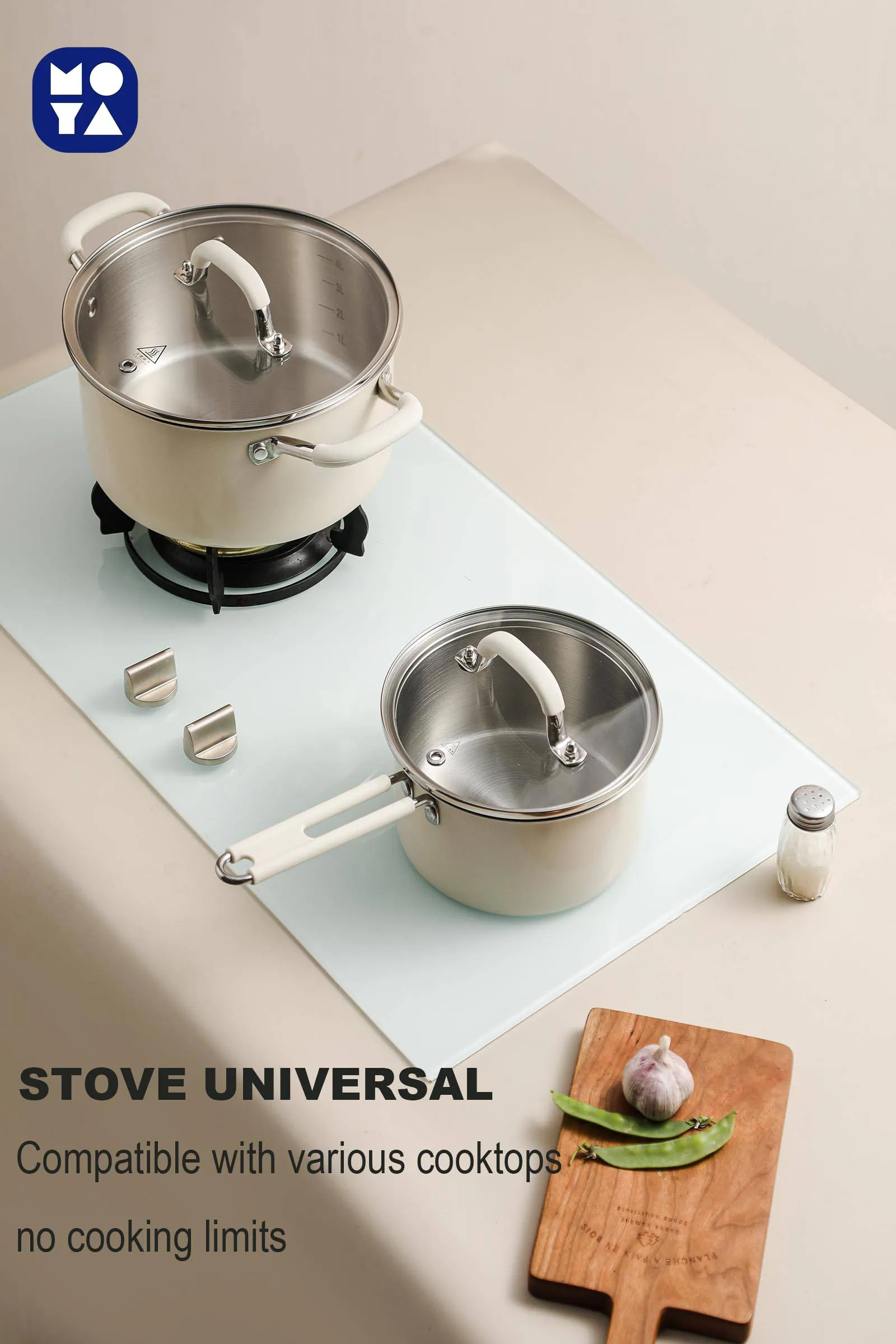 MOYA クリームホワイト304三層鍋&蒸し器セット - ホームキッチン用耐熱ハンドル調理器具