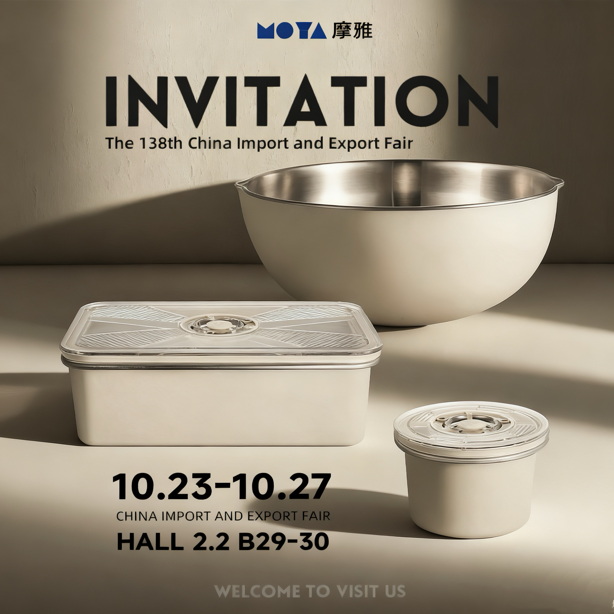 세계적으로 유명한 국제 무역 플랫폼인 제138회 중국 수출입 박람회(캔톤 페어)가 곧 개막할 예정입니다. 스테인리스 스틸 주방 용품 및 식품 용기 전문 제조업체 인 MOYA는 10 월 23 일부터 10 월 27 일까지이 그랜드 이벤트에 여러분을 진심으로 초대합니다..