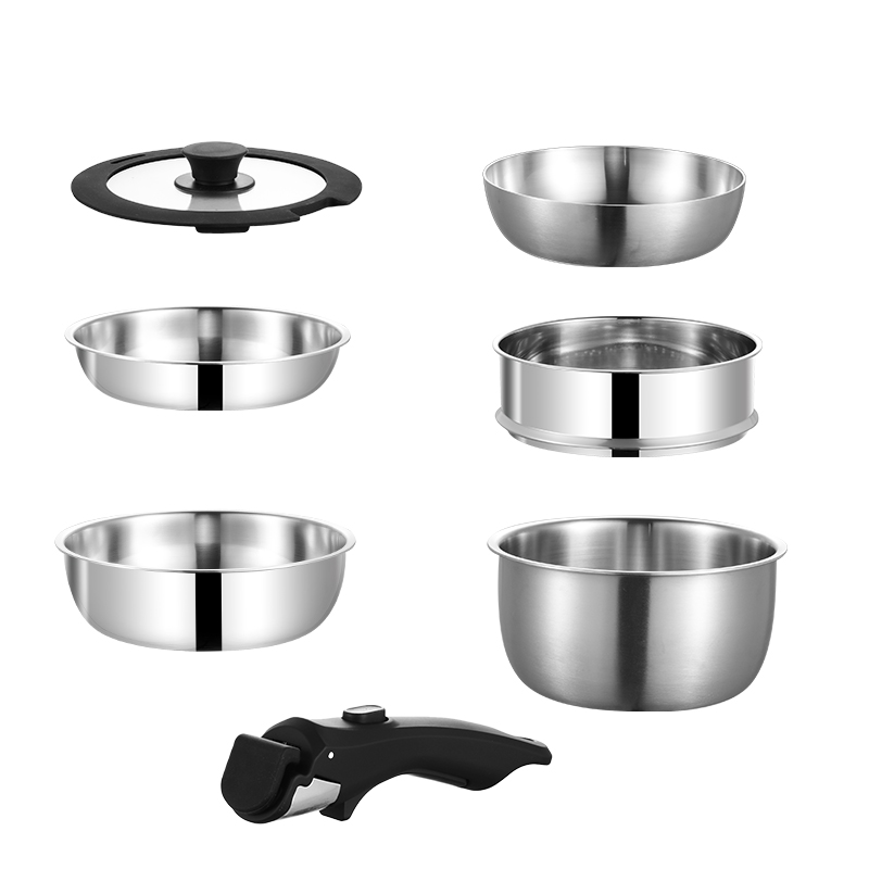 The set includes steamer, milk pot, soup pot, shallow frying pan, deep frying pan, cooking bowl, steaming rack and detachable handle, meeting all your daily cooking needs—from boiling milk, making soup, frying eggs to stir-frying vegetables. Suitable for gas stoves, induction cookers and other common stoves, versatile and practical.