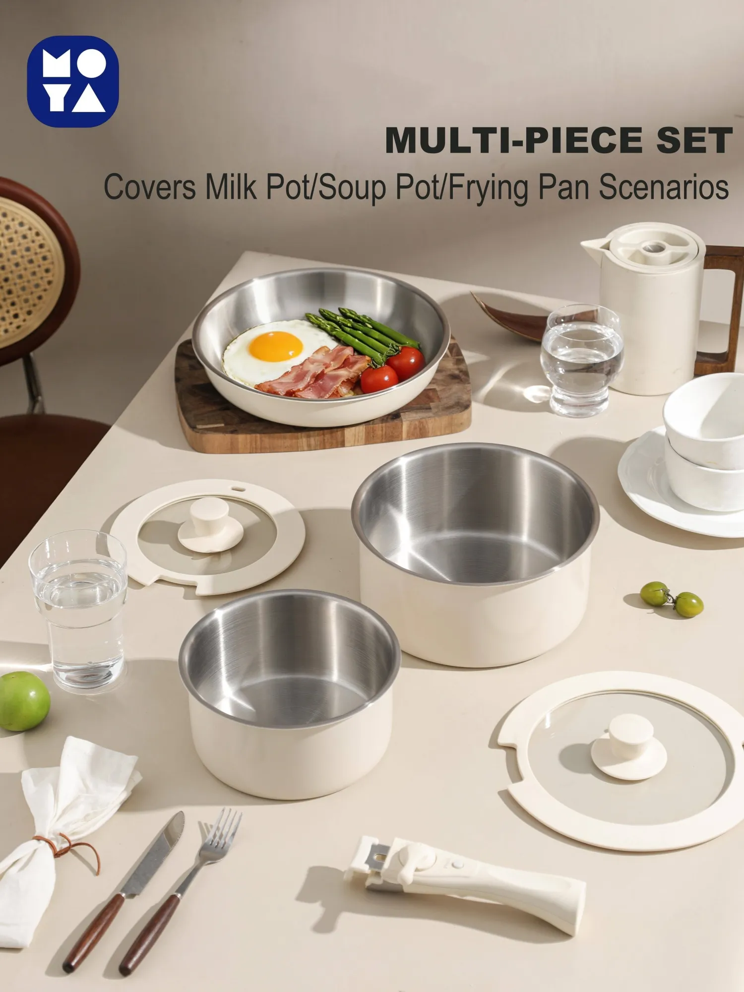 O conjunto inclui uma panela de leite, uma panela de sopa, uma frigideira rasa e uma frigideira funda, satisfazendo todas as suas necessidades culinárias diárias - desde ferver leite, fazer sopa, fritar ovos até fritar legumes. Adequado para fogões a gás, fogões de indução e outros fogões comuns, versátil e prático.