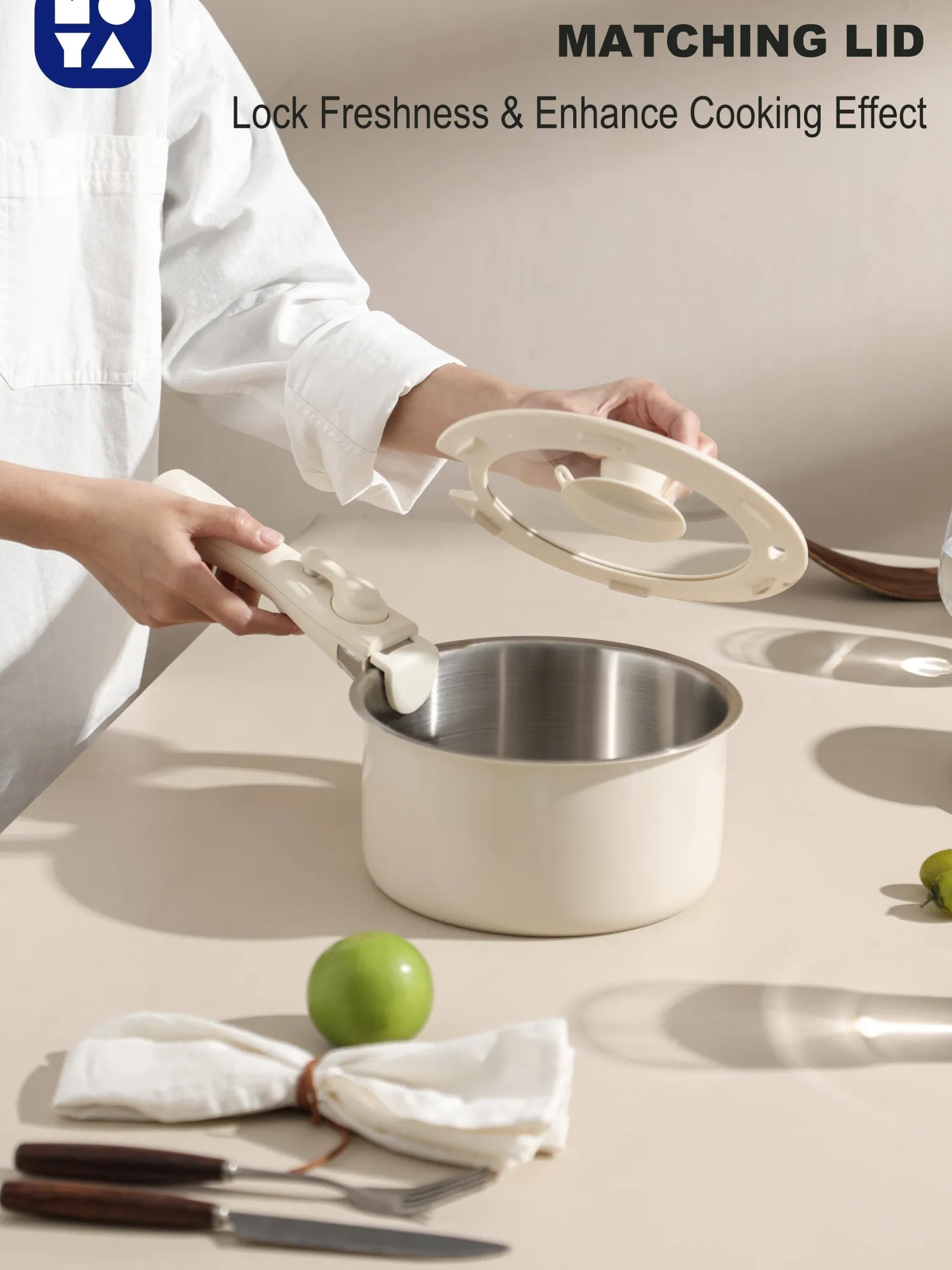 Conjunto de panelas em aço inoxidável SUS 304 branco cremoso com três camadas - cabo amovível e design aprofundado